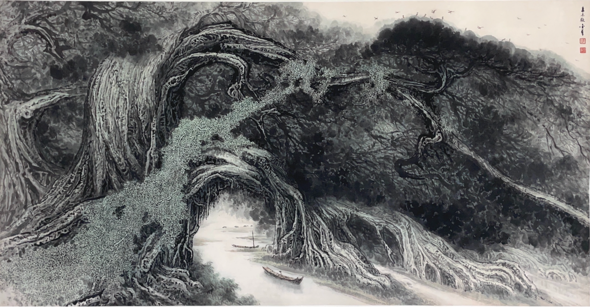 陈金章,1929年生于广东省化州县,1947年考入广州市立艺专,专攻中国画,师承岭南画派大师高剑父、黎雄才、关山月等。行为岭南画派第三代的代表东说念主物,陈金章不仅招揽了前东说念主的精神,更以更始的手法将岭南画派推向了新的高度。他对点、擦、皴、染等传统技法的精妙讹诈与泰西绘制优点的精巧交融,在本次展览中的《榕乡》《飞瀑云山》等作品中赢得了充分的体现,展现了其深厚的绘制功底和对当然好意思的深化相识。